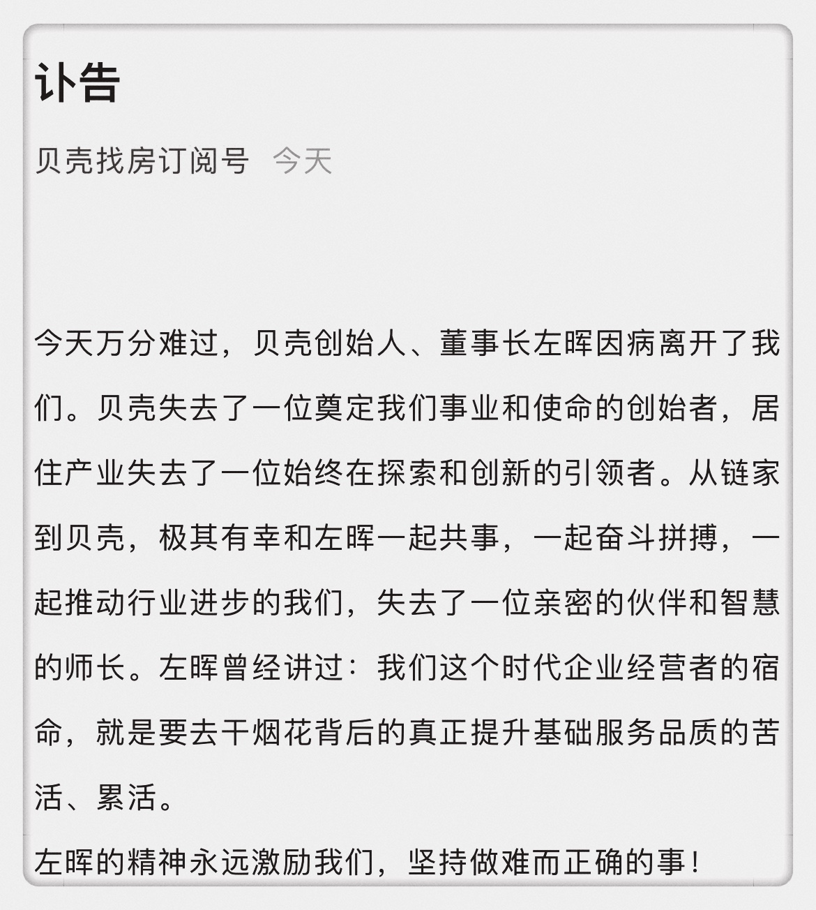 惊闻左晖先生今晨病情突然加重,溘然离世,心中万分悲痛。左晖一手创立了链家公司,贝壳找房,同时也是愿景集团的联合创始人。左晖一直秉承“做难而正确的事”,我们会在这种精神的引领和激励下,实现他改善居住、提升服务、规范行业的理想。