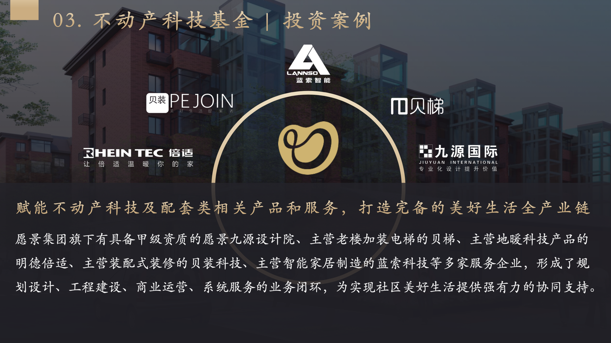 聚焦家庭居住消费升级需求,通过投资并赋能美好生活及Proptech相关企业,实现社区及企业协同跨越式发展。